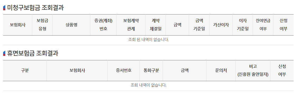 그리고 스크롤을 아래로 내려보니 미청구보험금과 휴면보험금 조회 결과가 확인이 되는데요. 저는 제때 청구해서 보험금을 모두 수령한지라 조회내역이 보이질 않았습니다.