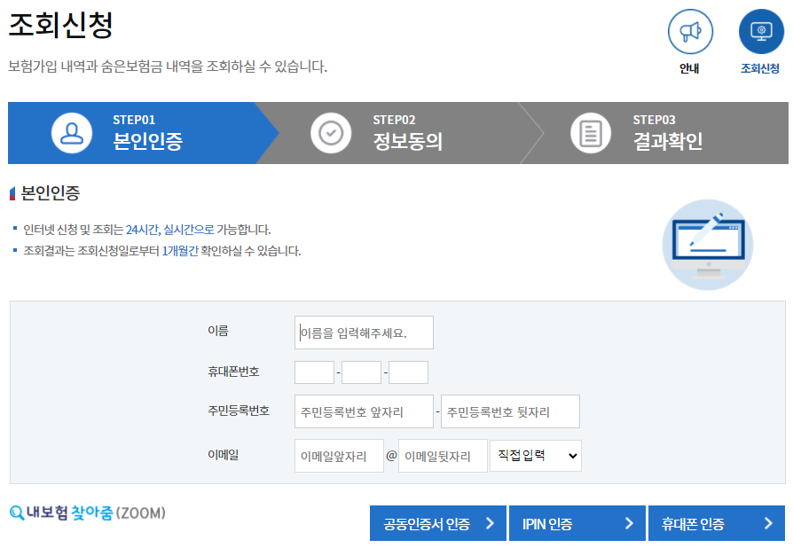 그리고 숨은보험금 조회하기를 클릭하시면 개인정보 입력 후 간단하게 본인인증을 진행해 주시는데요. 공동인증서와 휴대폰 인증 그리고 아이핀 인증이 있으니 그중 편하신걸 골라서 인증 진행해 주시면 됩니다.